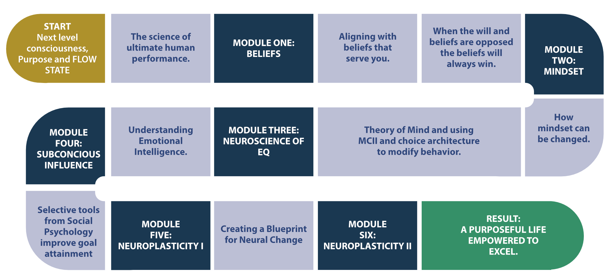 We’ve engineered a superior client experience to ensure success. We begin by defining purpose, which prepares clients for the FLOW STATE, a heightened state of consciousness. Then six modules leveraging tools to, Modify Behavior, Mindset, Beliefs, and Emotional IQ. The Nudge Theory, Mental Contrasting with II (MCII), and the latest Social Psychology and Mind Theory research. Neuroplasticity and the Brain’s unique ability to adapt. Creating a sustainable, attainable Blueprint for Change. Tools to support change so your clients can live a purposeful life and have the tools to achieve excellence.
